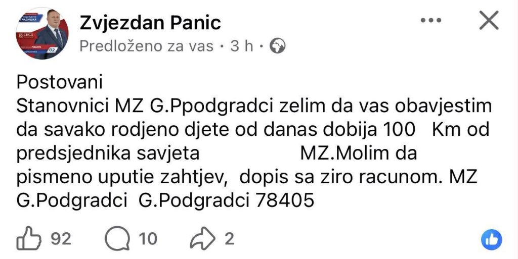 Naime, Panić je putem svog fejsbuk profila objavio post u kojem obavještava stanovnike Gornjih Podgradaca da će svako novorođeno dijete iz ove mjesne zajednice dobiti 100 KM od predsjednika Savjeta MZ, tačnije njega. Ništa tu ne bi bilo sporno da sama objava u dvije rečenice ne sadrži skoro 10 pravopisnih grešaka.