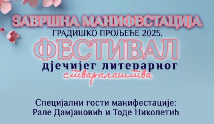 Završna manifestacija Festivala dječijeg literarnog stvaralaštva „Gradiško proljeće 2025“ održaće se u četvrtak, 19. juna od 18 časova u Kulturnom centru Gradiška.